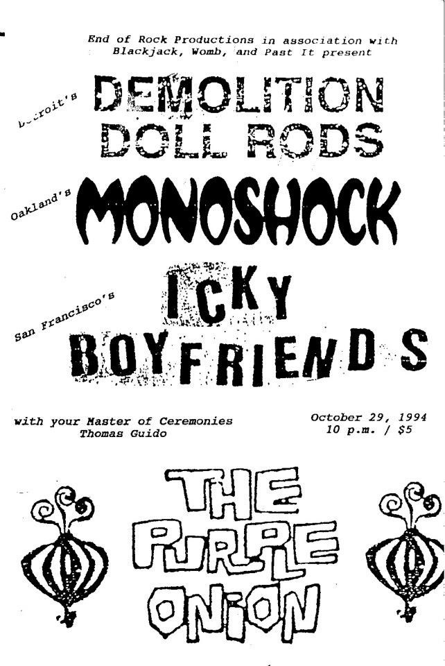 Flyer from 1994 “End of Rock” show with The Demolition Doll Rods, Monoshock and Icky Boyfriends, courtesy of Anthony Bedard’s Facebook page. Anthony, who headed up Past It Records, and I put this show on together (we also put out the Doll Rods first single). I actually couldn’t attend it, having been previously committed to some work-related trip to New Jersey or somewhere thereabouts.