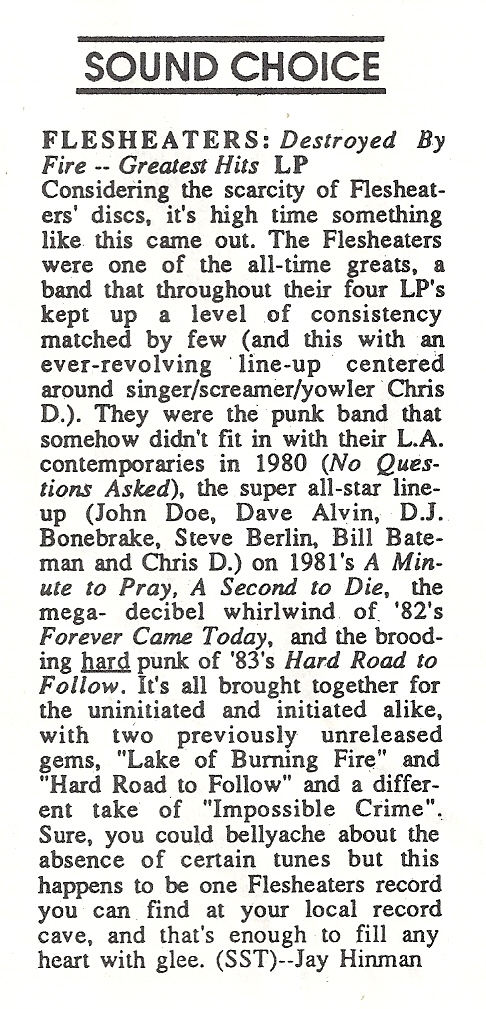 Ciaffardini was a very friendly guy who wanted to help mold me into a journalist/publisher, and to some extent he helped me along – giving me my first forum for written record reviews, which later led into me publishing my own fanzine. I’m not sure I would have let some 20 year old dum-dum write reviews for me, but there you go. Here’s one I wrote on The Flesh Eaters when their “greatest hits” collection came out on SST in 1988.
