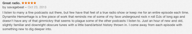 Huge thanks for SavageBeat for the kind words on Dynamite Hemorrhage Radio over on iTunes. If this makes you wanna listen to our crazy-ass rocknroll show, come over here and check them all out. New edition is being recorded over the weekend or soon thereafter.