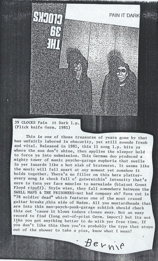 39 CLOCKS review from “Bernie”, aka Tom Lax, in Siltbreeze fanzine #4, appx. 1988.