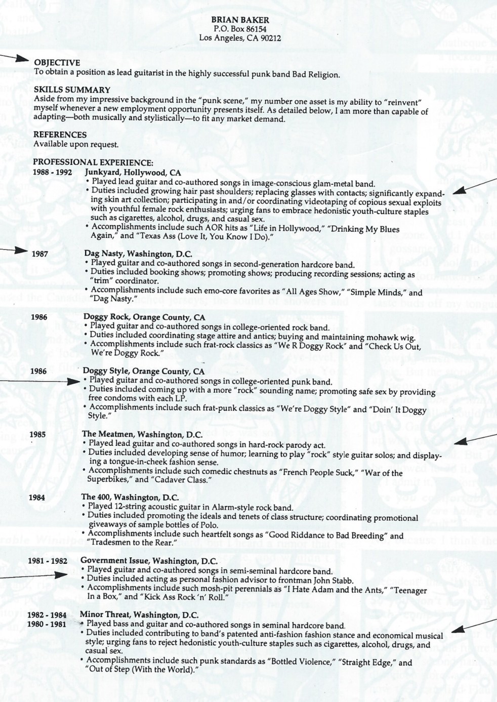 Brian Baker’s CV/resume, courtesy of a mid-90s issue of Motorbooty. Had forgotten he was in “Doggy Style”.