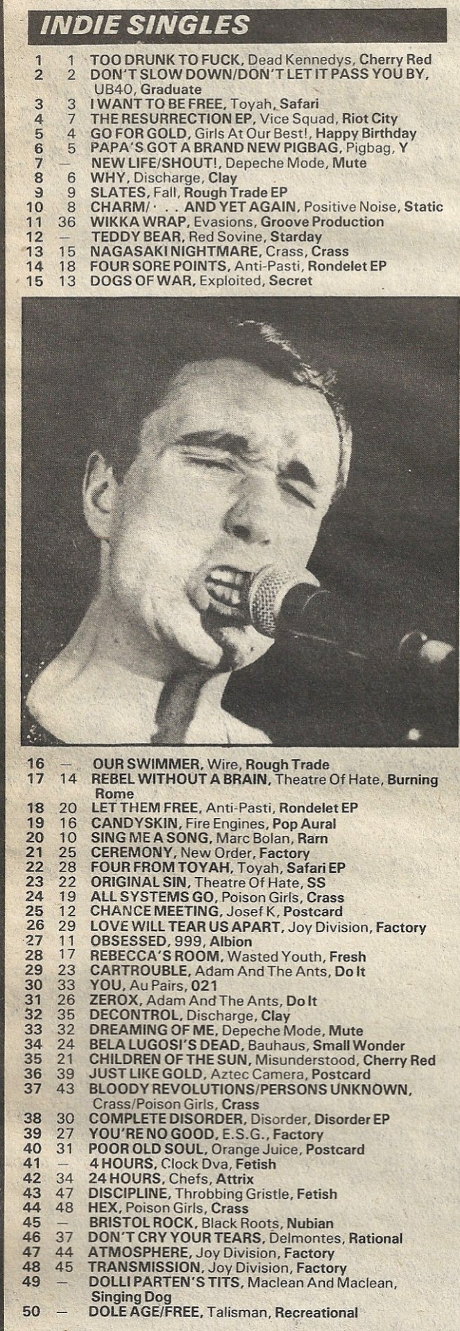 I bought a copy of the UK’s SOUNDS magazine, dated June 18th, 1981, a few weeks after it came out at Little Professor Book Center in San Jose, CA. I was 13 years old, and it upended my world. Take a look at the “Indie” charts that week.