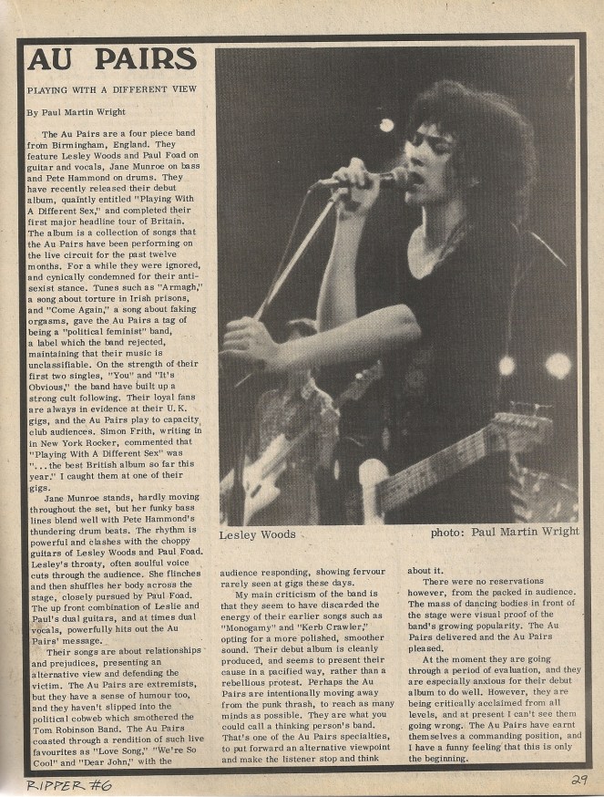 An article on the AU PAIRS from RIPPER fanzine in 1981.
