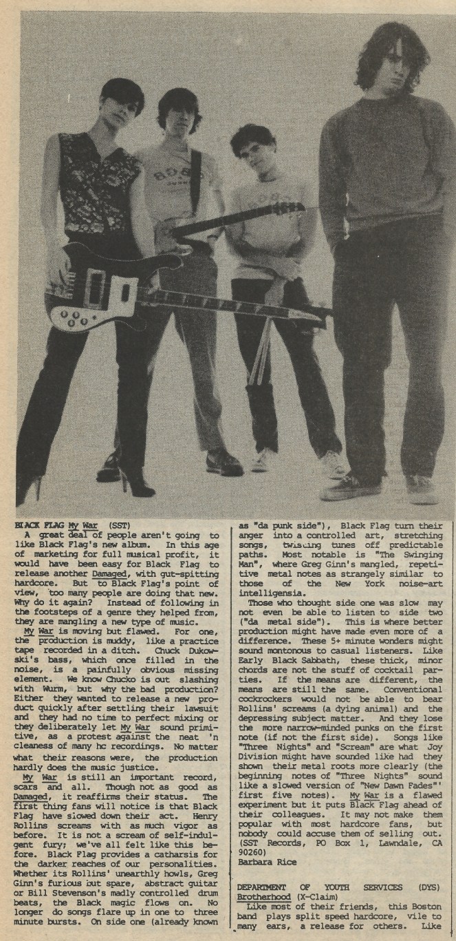 Black Flag was a total joke to us as they were hoofing it around the country those last two years, with the straining, sweating, whining, “life-is-pain” magnum opi they’d play while dressed in dolphin shorts to baffled punks looking to slam and stagedive. Granted, that confrontational, two-steps-ahead approach to music creation is what makes them interesting to read about, but certainly not to listen to at the time.
