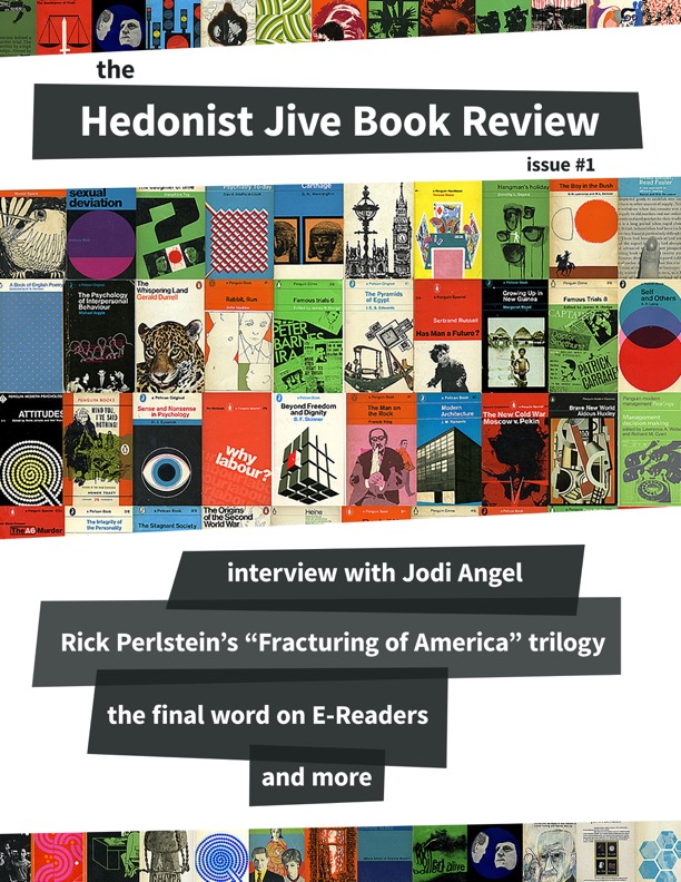 We interview the amazing Jodi Angel, who’s written some of the most moving and transcendent short stories of this or any era. There’s a big piece on the Rick Perlstein trilogy on 1960s-1970s American upheaval and turbulence. I’ve even crafted “The Final Word in Defense of E-Readers”. And over 20 book reviews to round the thing out.