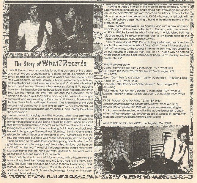 Here’s a cool article on the excellent WHAT RECORDS?, LA-based label who put out the first DILS single, the first GERMS 45, the KAOS 12" and a few other masterpieces. It came from a Seattle fanzine called DO THE POP! that I’ve got some other good scans from, and that I’ll be doling out accordingly.