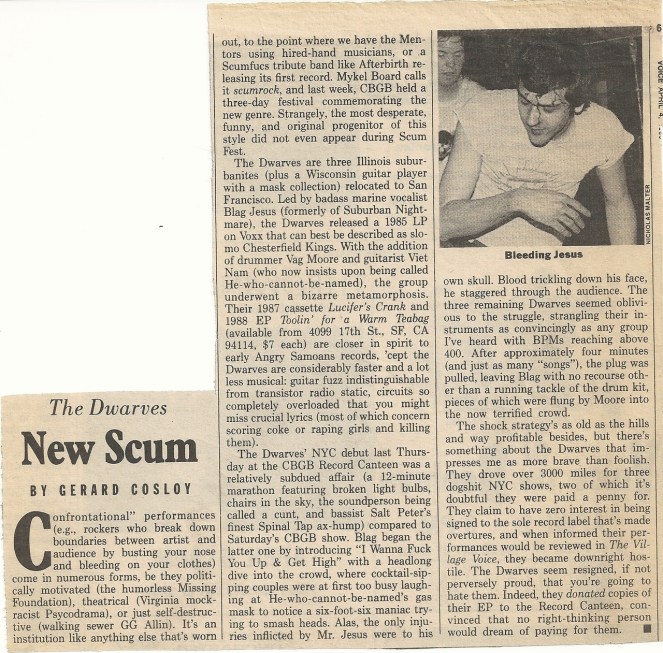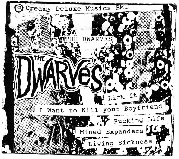 My favorite of the 7 acts featured here after the Driving Wheels is hands-down THE GAPING WOUNDS, whom I once stumbled upon at the Chatterbox around 1989 or so and never saw nor heard again until this here record. Imagine “Toolin For A Warm Teabag”-era DWARVES with a sneering, pissed-off heroin hottie on vocals instead of Blag Jesus, blowing through a bunch of gnarly ‘core for maybe 10 minutes – oh, and two members actually were in the Dwarves, and around ’89 no one could touch the Dwarves.