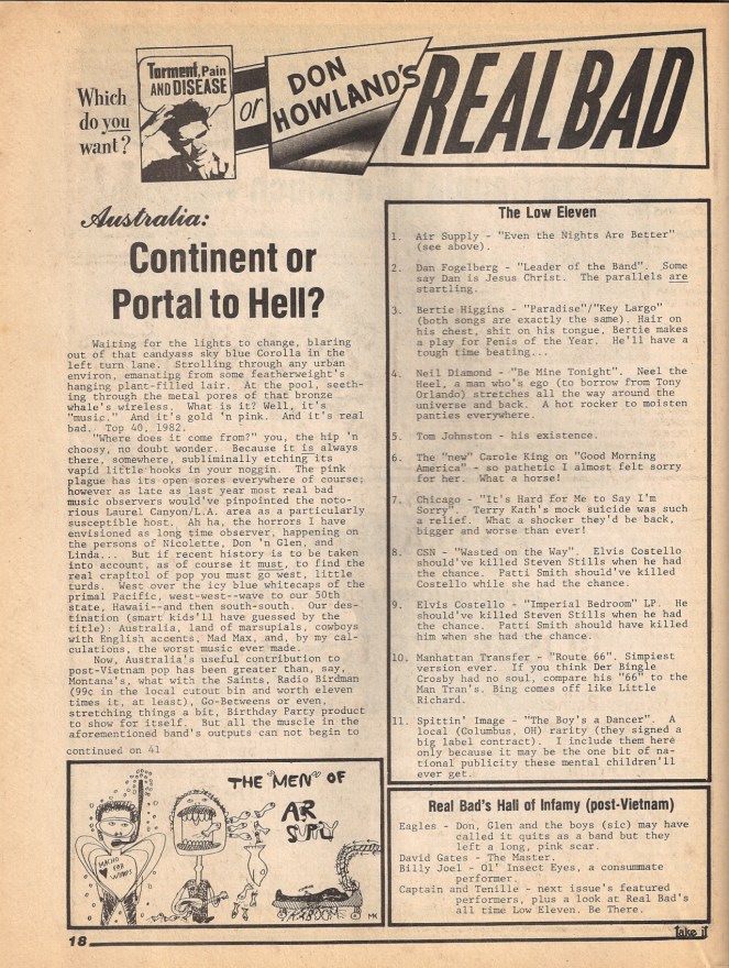 DON HOWLAND, later of the Gibson Bros, had a great column in TAKE IT! fanzine called “Real Bad”. This one’s from a 1983 issue and contains a classic “Low 11” list of that era’s easy-rock favorites.