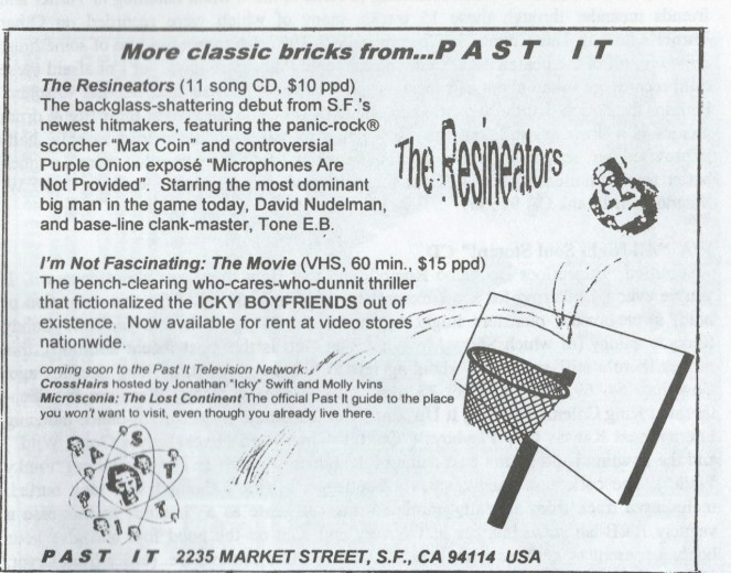 Advertisement for San Francisco’s PAST IT records, 1998. They were the home of the Icky Boyfriends, Demolition Doll Rods, Leather Uppers and other demented garage acts of the day. I happen to know that the owner/manager of the label was in a big NBA basketball phase at the time.