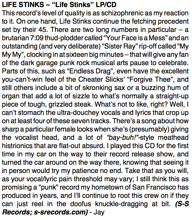 The sheer rip-off audacity of this band is so over the top, I can’t help but admire them. LIFE STINKS blatantly and without apology steal the riff from Flipper’s “Love Canal” on their new 45 – and it’s fantastic. They did the same thing with “Sister Ray” on their album, and if they’re cool with it, and you’re cool with it, I’m cool with it.
