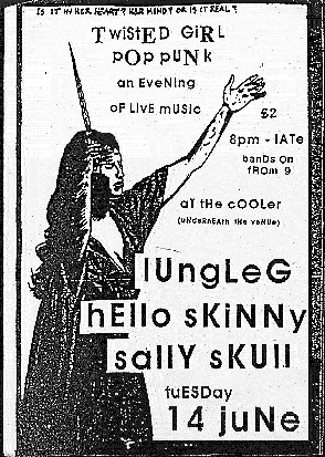 LUNG LEG, SALLY SKULL and HELLO SKINNY flyer for live show – Edinburgh, Scotland – probably 1996 or 1997. Borrowed Raymond Pettibon imagery.
