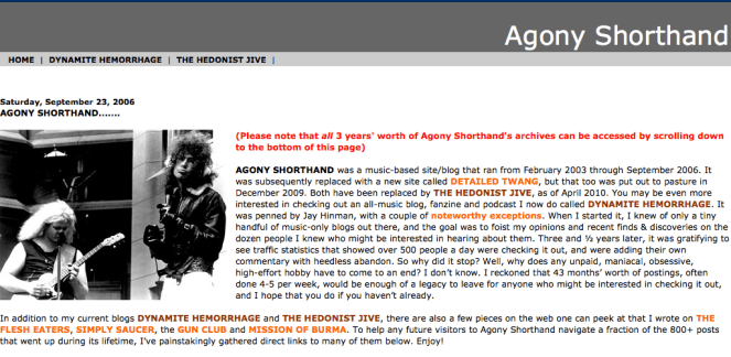 I’ve made brief mention of it in this forum, but never explicitly made known in a linkable, full-post form the horrible truth about another all-music blog that I used to helm from 2003-2006 called AGONY SHORTHAND. During its time it was, I guess, one of the “very early music blogs”; I know that when I got the idea to write online on February 5th, 2003 and posted this missive, I didn’t know of any others that I’d be interested in reading, and in fact can’t remember any others that were around at all, 11+ years later. It’s funny, there was an interview with one of the founders of one of the core all-mp3 underground music blogs not too long ago, can’t remember which, and he cited Agony Shorthand as a main “if that guy can do it, so can I” influence, which is flattering and illustrative, if only I could remember his name. The memory’s the first thing to go, folks.