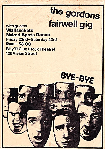 THE GORDONS “farewell” gig flyer; Wellington New Zealand. From what I can gather, this would have been 1981 or 1982, considering that Naked Spots Dance were also on the bill, who broke up in ‘83.