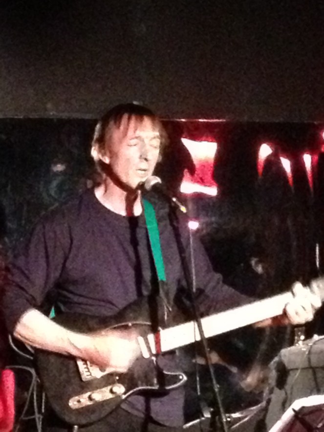 BILL DIREEN, whom I saw play a similar set back around 1993 in San Francisco, stepped up and strummed solo to a somewhat befuddled crowd. His playing and his word-poetry often seemed stream of consciousness, and when he played songs we knew, it was sorta the way Bob Dylan plays his 1960s songs live. Only the words and some occasional chords give up the ghost that this is a song you’ve actually heard before. Direen certainly exists in his own world, and plays the eccentric well. I got rolling with his vibe about midway through and it all started clicking then – and only then. He’s pictured here, a rare iPhone photo of the man in the wild in the 21st century. Why he was playing in Oakland, here and now, is a mystery for the ages. I meant to ask someone.