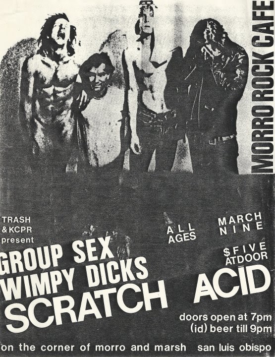 “I think even back in March 1987, I knew I was pretty lucky to have seen SCRATCH ACID play live, not simply because I could sense that they’d break up soon (which they did), but because they seemed fairly groundbreaking in their way even at the time. The show was at a dumpy club in small college town San Luis Obispo, California with two bands I’ll have a hard time forgetting: ”GROUP SEX“ and the ”WIMPY DICKS“. The latter were some dumb-ass local favorite funnypunk band with songs that ragged on their town, but the former were just on fire the night I saw them.