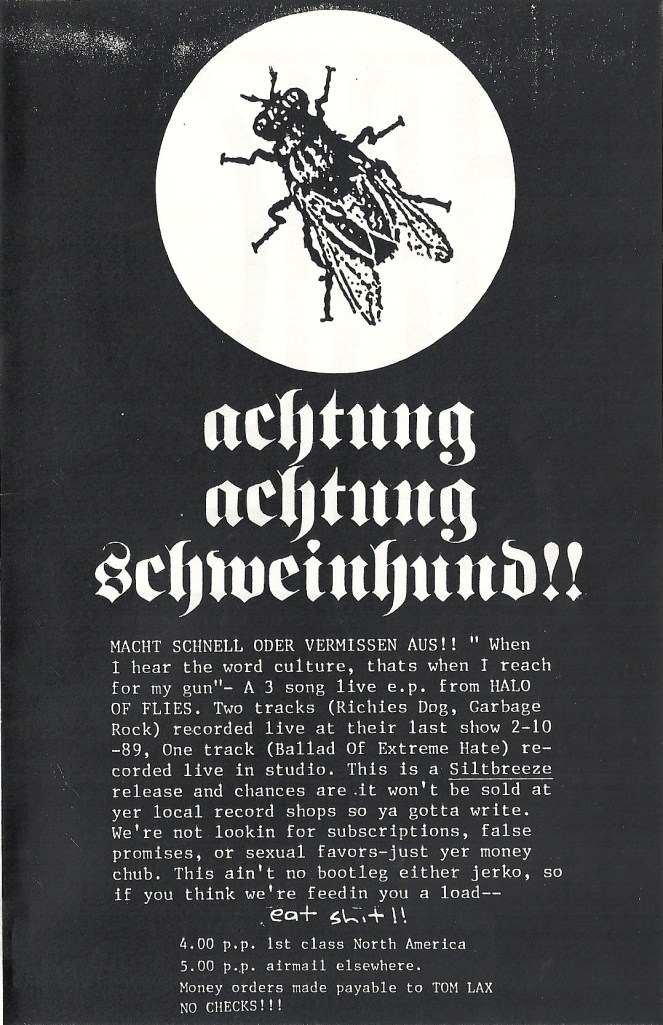 Ad for the 3-song HALO OF FLIES single Siltbreeze Records put out in 1989, the very first release for that label.