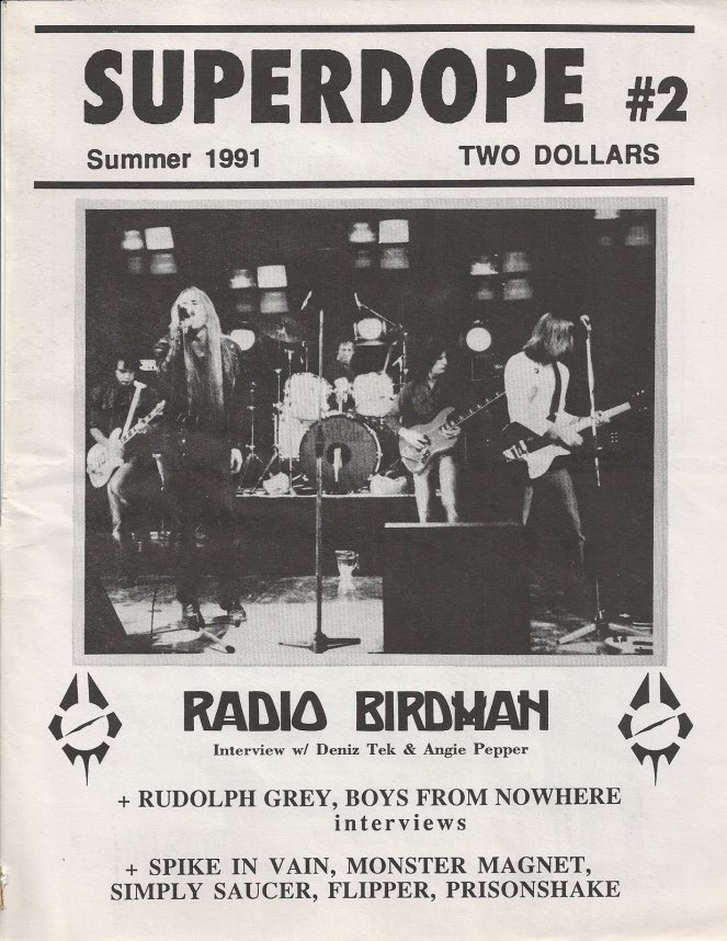 Here’s a full and complete scan of the first fanzine I ever put out, SUPERDOPE #1. It was written 24 years ago and released to the people in Spring 1991. Obviously a project like this created in the bloom of one’s youth (I was 23) engenders a strange mix of pride and revulsion. Pride – well, I put this together completely by hand over several months, using scissors and glue and 3-cent photocopies at a local place who gave me a discount. I used to lug home a gigantic beige Mac from my workplace which was running Windows 2.0 (or whatever was five years before Windows 95) and some rudimentary version of Word, and peck this magazine out at home in the evenings, before returning it back to the “shared workstation” at Monster Cable the next day.