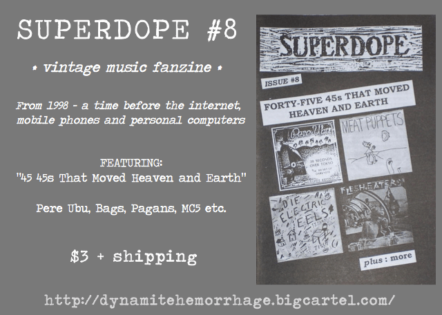 • The contributors this time were Doug Pearson – a local pal who, until recently, was front & center at every single rocknroll show I went to, leading me to believe that for every show I attended (which is one every 6-8 weeks, maybe?) he was holding court at twenty – and Tom Lax, then as now the proprietor of SILTBREEZE records. I wrote the rest. I knew of Lax as a writer first, before he started the label. His stuff was funny, deeply knowledgeable and intensely aware of every sub-movement and sub-sub-movement in every forgotten crawlspace of underground rock, in every nook & cranny of the globe. When he still writes for his Siltblog, which is unfortunately infrequently, it’s essential reading. I thought it was a “pretty big coup” that he felt Superdope good enough to lend his name to.