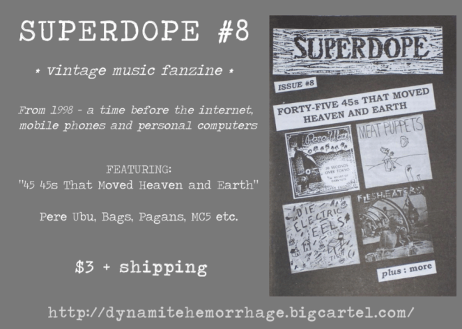 Turned out it was pretty much the end of Superdope fanzine, as well – at least for four years. In 1998, I came back and published one final issue of the magazine. Alas, it’s the only one I still have any copies of anymore, and if you’re interested in it, this post provides some details on how to order it. #7, the one I’m posting here – well, I’m afraid you’ll have to scour the fanzine aftermarket. Or just download it here