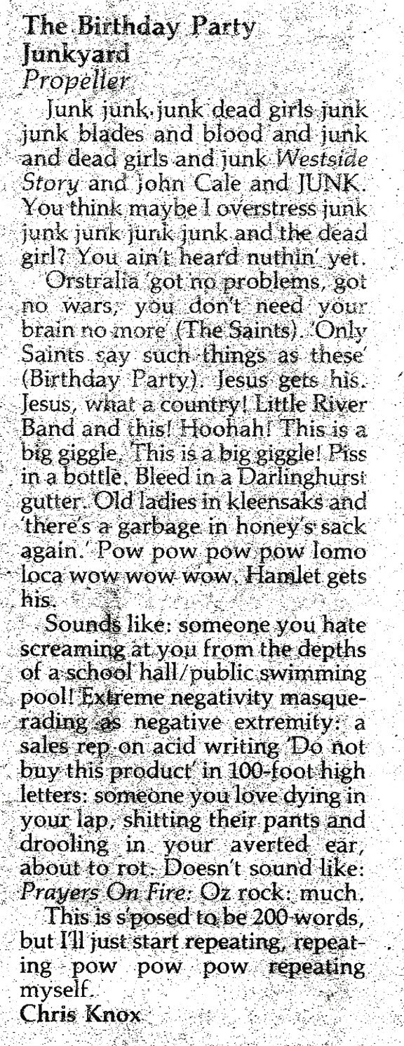 Chris Knox on THE BIRTHDAY PARTY, from New Zealand’s Rip It Up fanzine, November 1982.